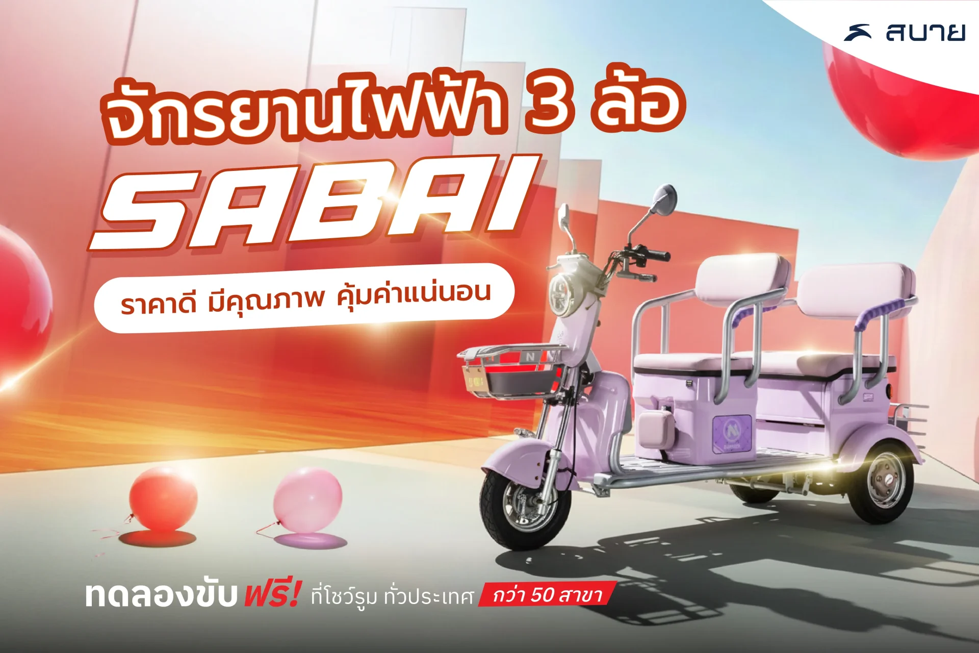 ปัจจุบันสถานการณ์โลกและบ้านเมืองมีแต่ความไม่แน่นอน ข้าวของแพงไม่พอ ราคาน้ำมันก็สูงขึ้นด้วย ทำให้รถไฟฟ้าเป็นทางเลือกที่ดี สำหรับคนที่มองหายานพาหนะมาใช้งาน หากพลังงานหมดก็สามารถใช้ไฟบ้านชาร์จแบตได้ทันที รวมทั้งยังเป็นมิตรต่อสิ่งแวดล้อม ไม่ปล่อยควันไอเสีย และไม่ส่งเสียงดังรบกวนเพื่อนบ้านอีกด้วย จักรยานไฟฟ้า 3 ล้อ Sabai มีราคาไม่แพง เริ่มต้นเพียงหลักหมื่นบาทเท่านั้น หากสนใจรุ่นไหน สามารถเข้ามาทดลองขับที่หน้าร้านได้ทุกสาขา หรือสอบถามเพิ่มเติมได้ที่นี่
