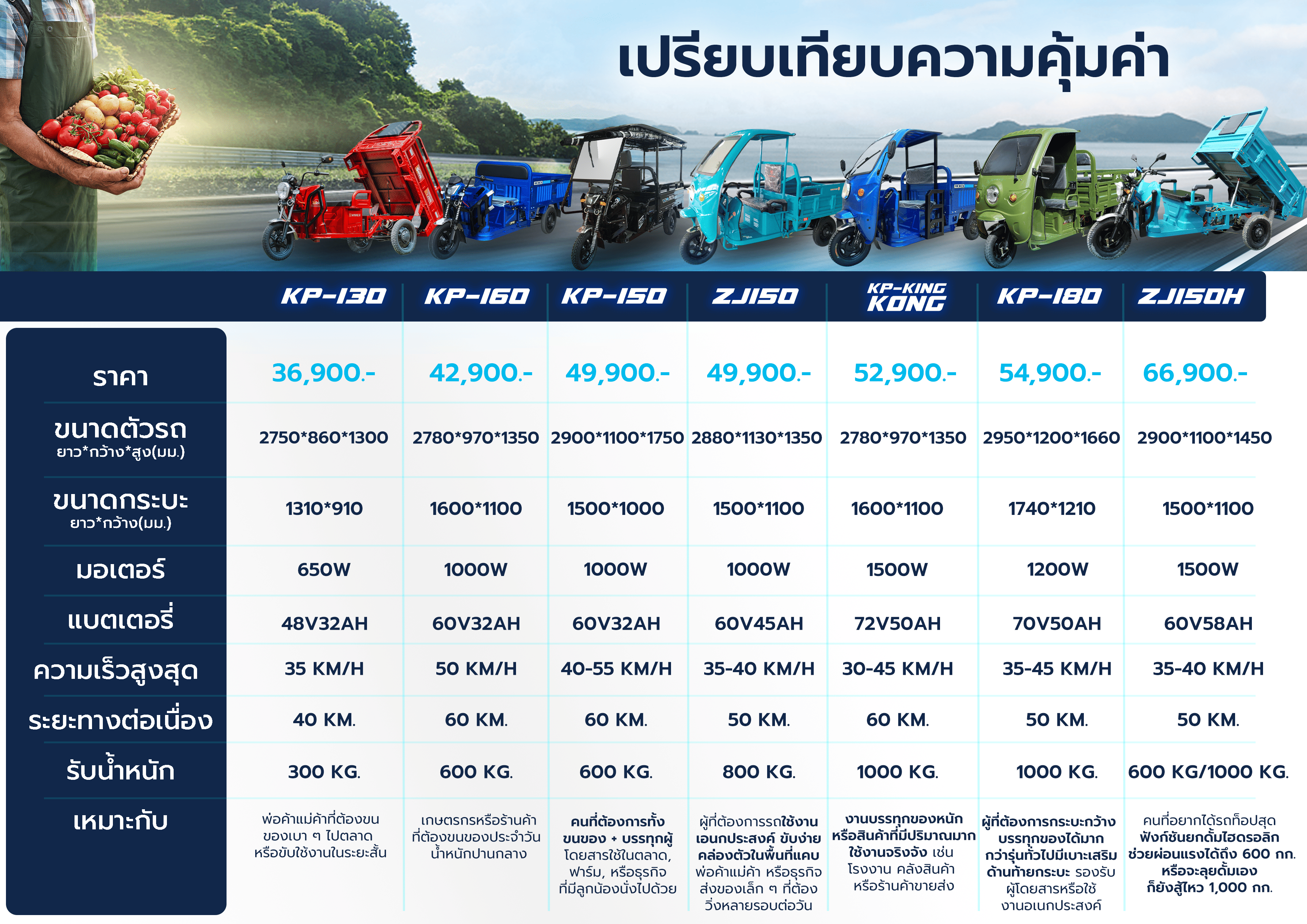 เหมาะสำหรับพ่อค้าแม่ค้าตลาด หรือใช้งานในระยะสั้น บรรทุกได้ 300 กก. ความเร็วสูงสุด 35 กม./ชม. - KP-160 – ใช้งานกลาง ๆ (42,900.-)