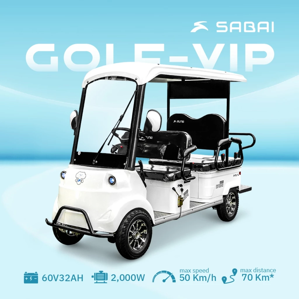 SabaiMall - Golf VIP รถกอล์ฟไฟฟ้า 6 ที่นั่ง มีพวงมาลัยควบคุมทิศทาง พร้อมหน้าจอดิจิทัลแสดงสถานะการใช้งาน เบาะนุ่มนั่งสบาย มีพนักพิงและสายคาดเบลท์ในตัว บริเวณที่นั่งด้านหลังมีราวกั้นเพื่อความปลอดภัย และช่องเก็บของขนาดใหญ่จุได้เยอะ รุ่นนี้ใช้แบตเตอรี่ขนาด 60V32AH กำลังมอเตอร์ 2000W วิ่งด้วยความเร็วสูงสุดได้ 50 กิโลเมตร/ชั่วโมง ระยะทางวิ่งต่อเนื่อง 70 กิโลเมตร รองรับน้ำหนักโดยรวมได้มากกว่า 300 กิโลกรัม