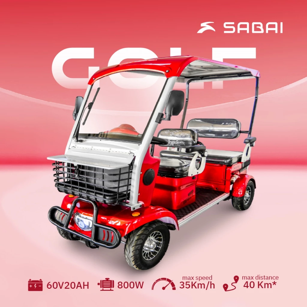 SabaiMall - Golf รถกอล์ฟไฟฟ้า 3 ที่นั่ง (รวมคนขับ) เบานุ่มนั่งสบาย มาพร้อมแบตเตอรี่ 60V20AH กำลังมอเตอร์ 800W สามารถวิ่งได้ไกลต่อเนื่อง 30-40 กิโลเมตร ด้วยความเร็วสูงสุด 30-35 กิโลเมตร/ชั่วโมง รองรับน้ำหนักได้มากถึง 300 กิโลกรัม มีการใช้โช้กช่วยลดแรงสั่นสะเทือนขณะใช้งาน มีหน้าจอดิจิทัลแสดงสถานะแบตเตอรี่ ความเร็วในการใช้งาน และทิศทางในการขับ เพื่อการขับขี่อย่างมั่นใจและปลอดภัย ยางขนาด 100/90-8 เกาะพื้นถนนได้ดี สามารถเก็บของได้ทั้งด้านหน้าและด้านหลังของตัวรถ